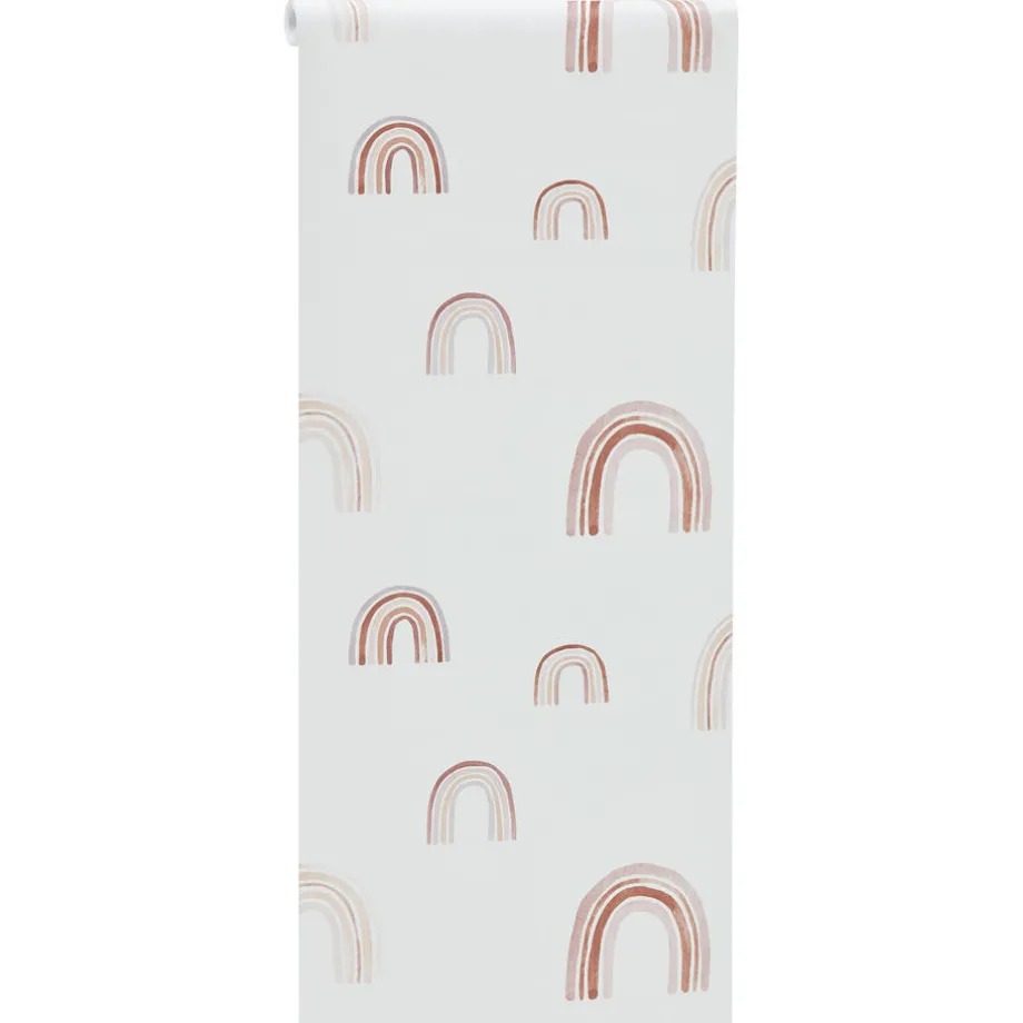 Wit vliesbehang met speelse regenbogen in bruine tinten. 53 cm breed. 10 meter per rol.