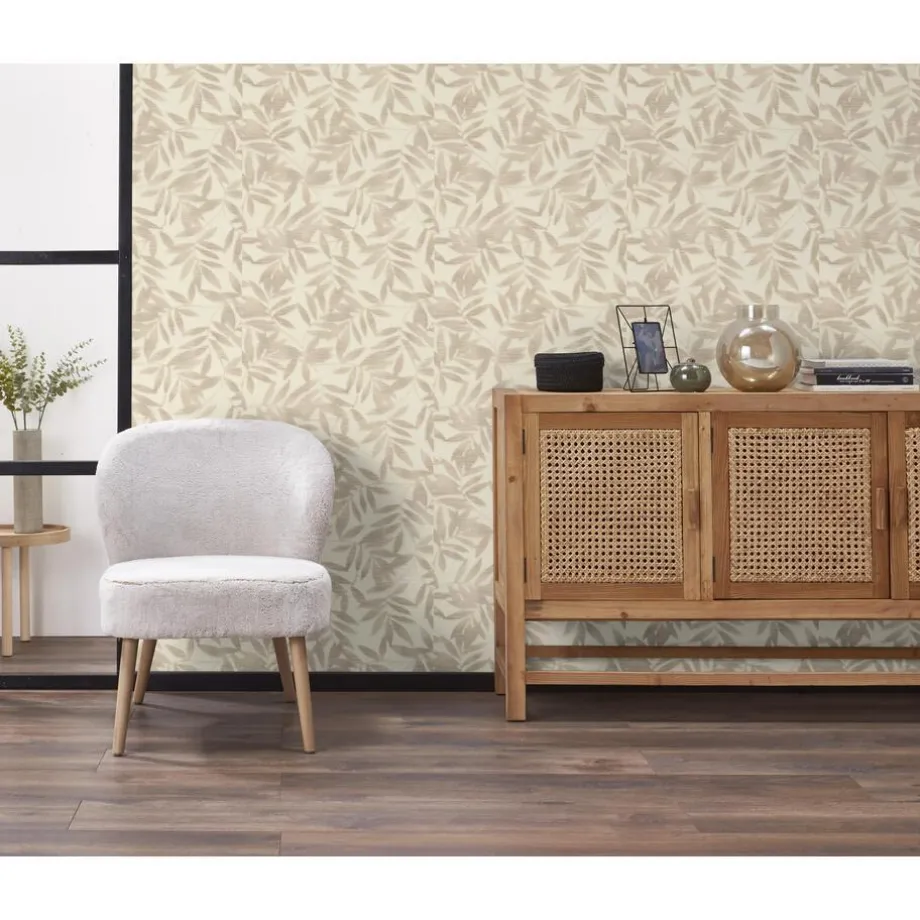 Vliesbehang zandkleurig met blad patroon. Voorzien van het FSC-keurmerk. Wand insmeren om te behangen. 10 meter per rol. 53 cm breed.
