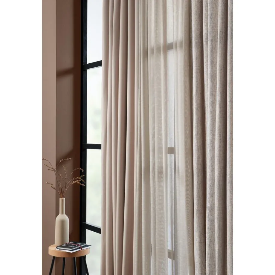 Soepelvallende zandkleurige gordijnstof. Stevig en kreukherstellend. 142 cm breed.