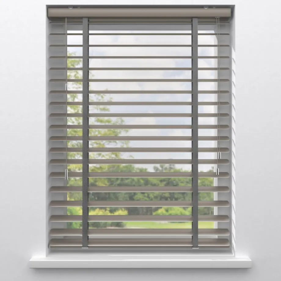 Aluminium jaloezie met zijdeglans taupe 50mm lamellen. De jaloezie heeft een cylindervormige metalen koordhanger, een aluminium systeemkleur en meekleurende eindkappen. Je hebt de keuze uit een ladderkoord of een ladderband. Kies je voor een ladderband, dan heb je de keuze uit diverse kleuren. De bediening is elektrisch of handmatig. Voor de handmatige bediening gebruik je koorden en geen tuimelstaaf. De jaloezie is vochtbestendig, eenvoudig schoon te maken en geschikt voor keukens en badkamers. Op maat te maken en eenvoudig met de juiste afmetingen te bestellen. Geschikt voor zijgeleiding en draai-kiepramen. Niet volledig verduisterend.
