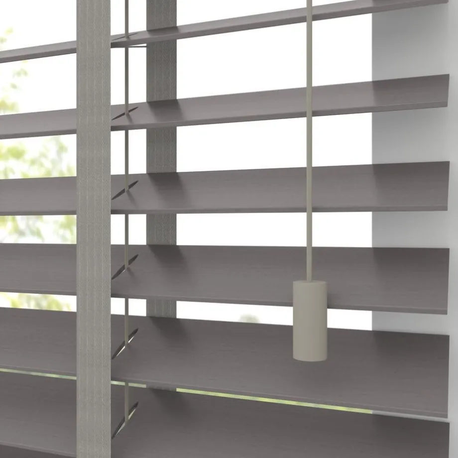 Houten jaloezie grijs met natuurlijke houtnerven en luxe uitstraling. 100% hout. De brede lamellen van 50 mm zorgen voor veel lichtinval en bieden veel privacy wanneer je deze sluit. Op maat te maken en volledig naar wens samen te stellen. Bepaal zelf de bedieningszijde en kies uit diverse accessoires en uitvoeringen. Keuze uit een bijpassend ladderkoord, 48 verschillende ladderbanden en een koordhanger van hout, rvs of zwart metaal.