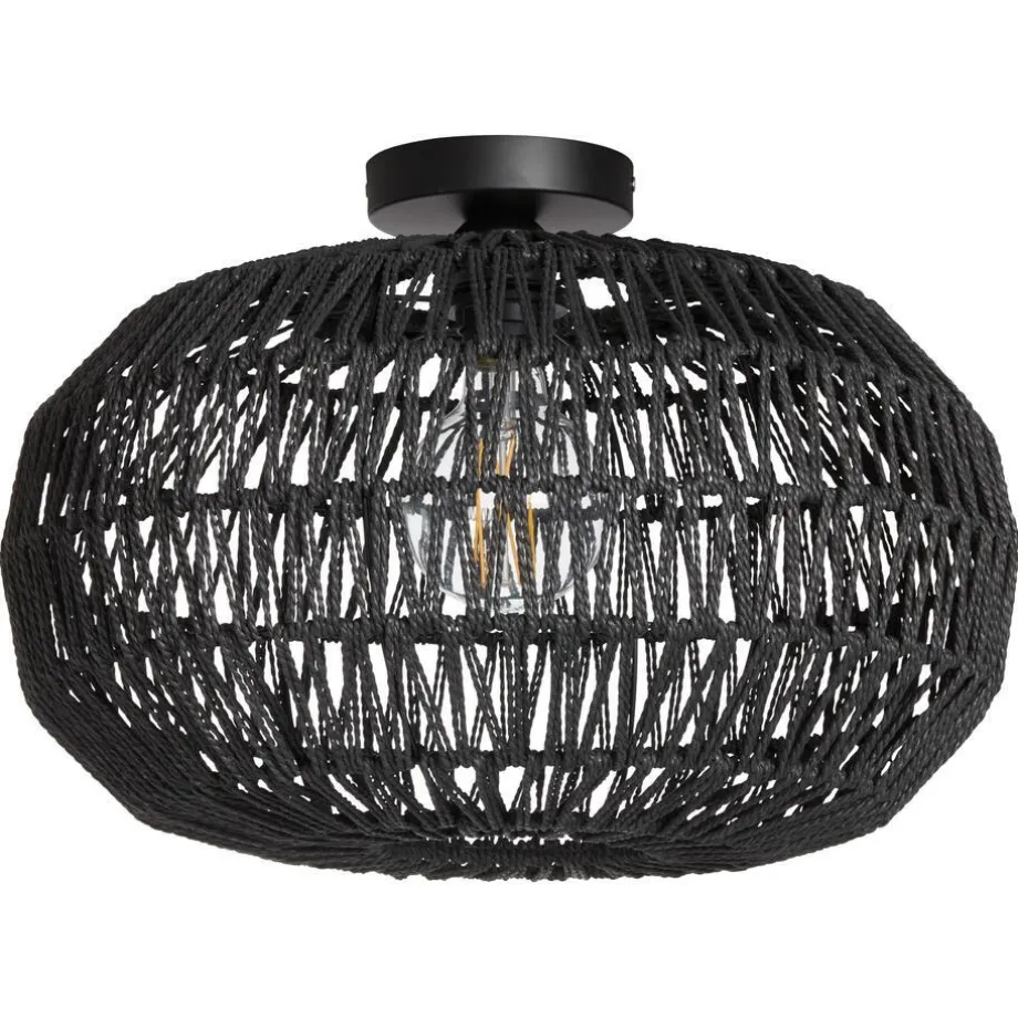 Ronde plafondlamp van zwart rotan. Energieklasse: A++. Grote fitting E27. 45×32 cm (bxh).