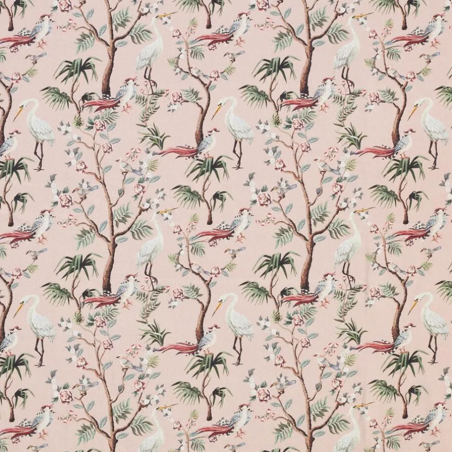 Gordijnstof roze met vogels. 100% katoen. Stevig en ademend. 140 cm breed.