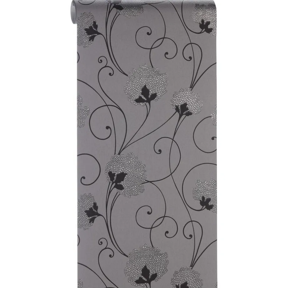 Vliesbehang grijs met sierlijk bloemdessin. Normaal afwasbaar. Voorzien van het FSC-keurmerk. Plakken met Perfax Roll-On. 10 meter per rol.