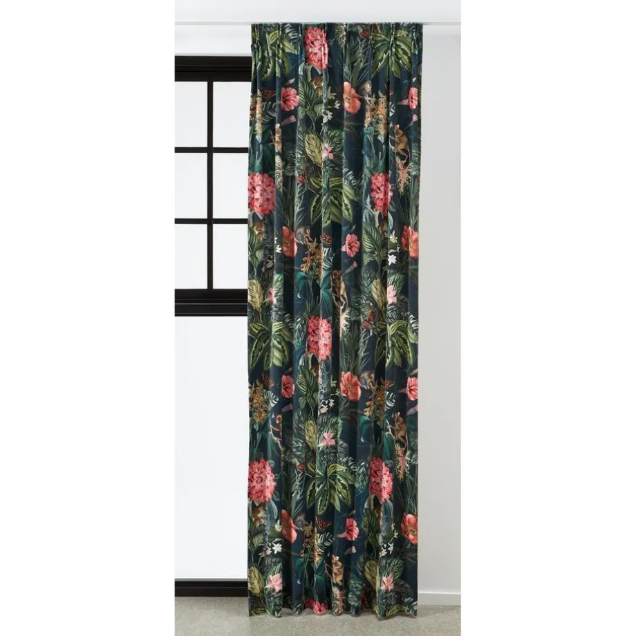 Lichtdoorlatende gordijnstof groen met bloemenprint. De glanzende velours stof is stevig, vormvast en soepel. 140 cm breed.