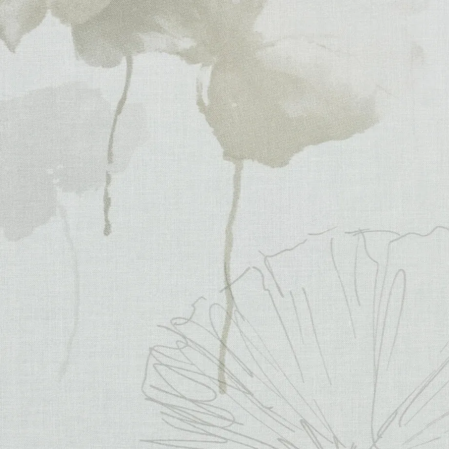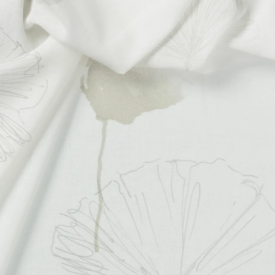 Vitrage Aukje in een witte kleur. Deze stof heeft een hele subtiele print van grijze bloemen. Gemaakt van 100% polyester. Patroonhoogte is 64 centimeter.