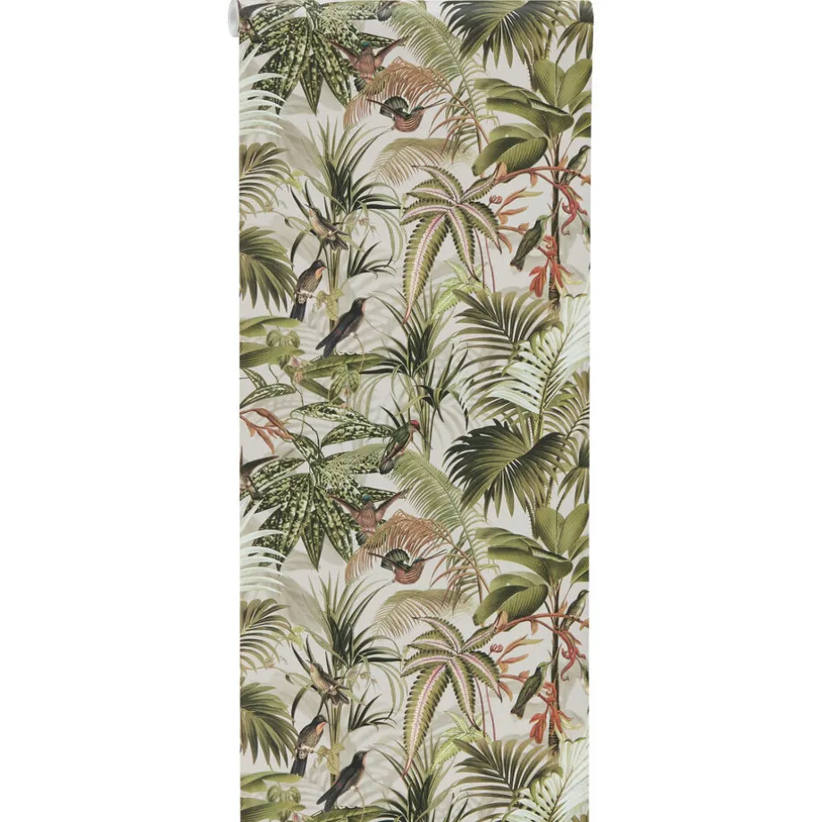 Lichtgroen vliesbehang met tropisch jungle dessin. 53 cm breed. 10 meter per rol.