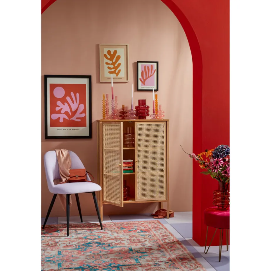 Kast van naturelkleurig 100% essenhout. De 2 deurtjes zijn gemaakt van webbing wat zorgt voor een natuurlijke en luchtige uitstraling. De kast heeft 2 planken over de gehele breedte. 80x35x115cm (lxbxh).