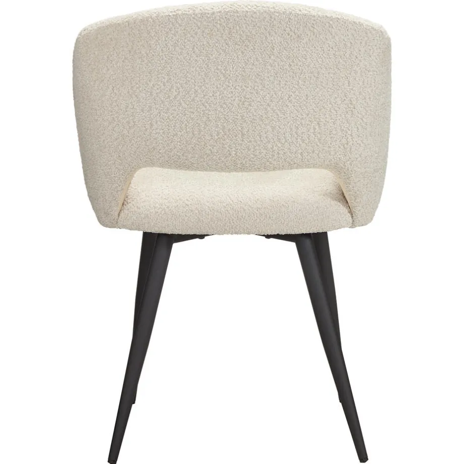 Comfortabele stoel gemaakt van een off-white kleurige bouclé stof. Met open rug, schuin aflopende armleuningen en zwarte poten. 57x59x81,5 cm (lxbxh).
