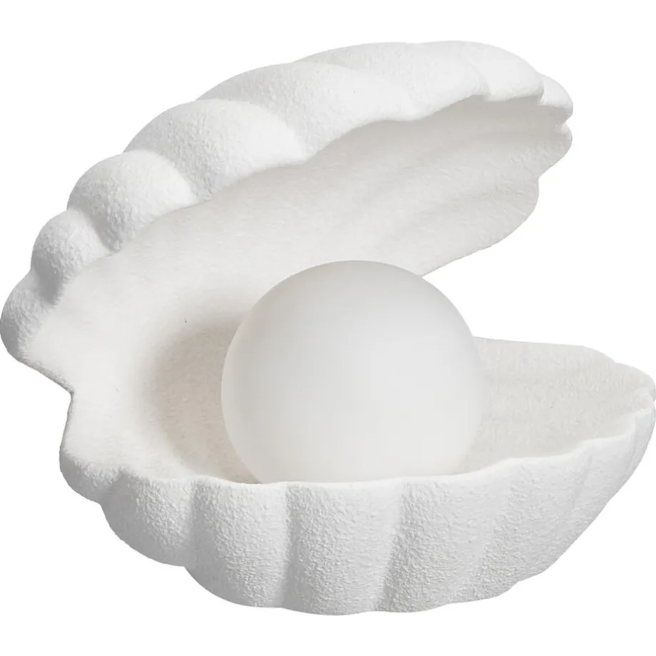 Witte tafellamp in de vorm van een schelp met een parel. Gemaakt van 70% porselein en 30% plastic. Werkt op batterijen. 15,5×15,2×13 centimeter.