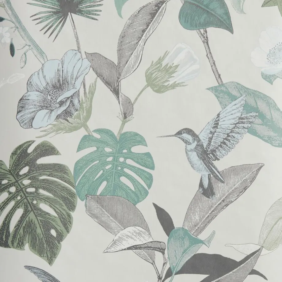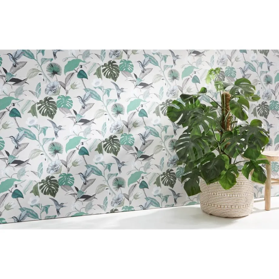 Vliesbehang multicolor met botanisch dessin van bloemen en vogels. Plakken met Perfax Roll-On.
