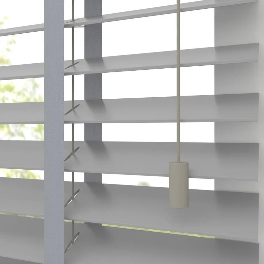 Houten jaloezie grijs met gelakte afwerking en lichte glans. 100% hout. De brede lamellen van 50 mm zorgen voor veel lichtinval en bieden veel privacy wanneer je deze sluit. Op maat te maken en volledig naar wens samen te stellen. Bepaal zelf de bedieningszijde en kies uit diverse accessoires en uitvoeringen. Keuze uit een bijpassend ladderkoord, 48 verschillende ladderbanden en een koordhanger van hout, rvs of zwart metaal.