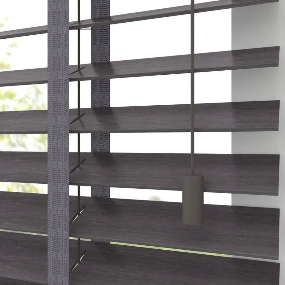 Houten jaloezie grijs met natuurlijke houtnerven en een authentieke luxe uitstraling. 100% hout. De brede lamellen van 50 mm zorgen voor veel lichtinval en bieden veel privacy wanneer je deze sluit. Op maat te maken en volledig naar wens samen te stellen. Bepaal zelf de bedieningszijde en kies uit diverse accessoires en uitvoeringen. Keuze uit een bijpassend ladderkoord, 48 verschillende ladderbanden en een koordhanger van hout, rvs of zwart metaal.