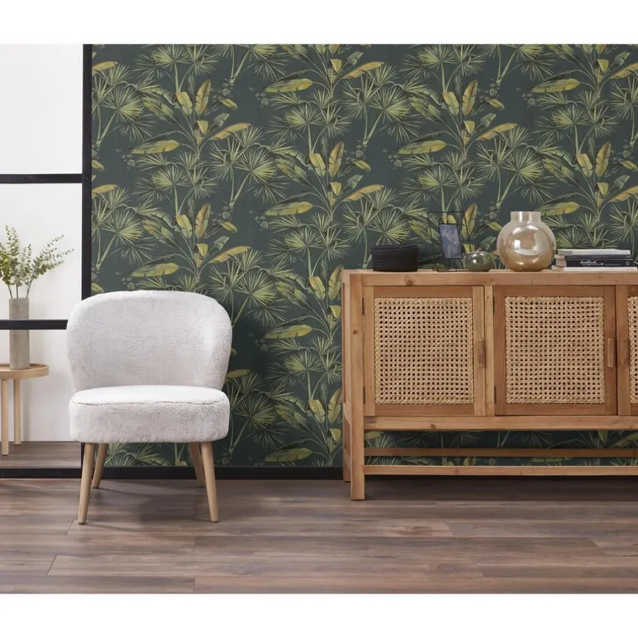 Vliesbehang groen met jungle patroon. Voorzien van het FSC-keurmerk. Wand insmeren om te behangen. 10 meter per rol. 53 cm breed.