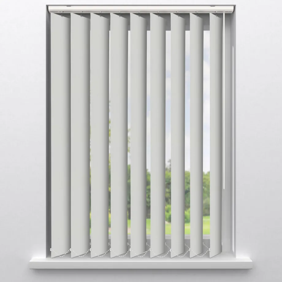 Verticale lamellen van grijs PVC. De lamellen zijn 9 cm breed. De syteemkleur en de tuimelstok zijn wit. Kies zelf aan welke zijde je de lamellen wilt bedienen en bepaal eenvoudig de mate van lichtinval. De lamellen zijn vochtbestendig, eenvoudig schoon te maken en ook te gebruiken voor keukens en slaapkamers. Op maat te maken en met de juiste afmetingen te bestellen.