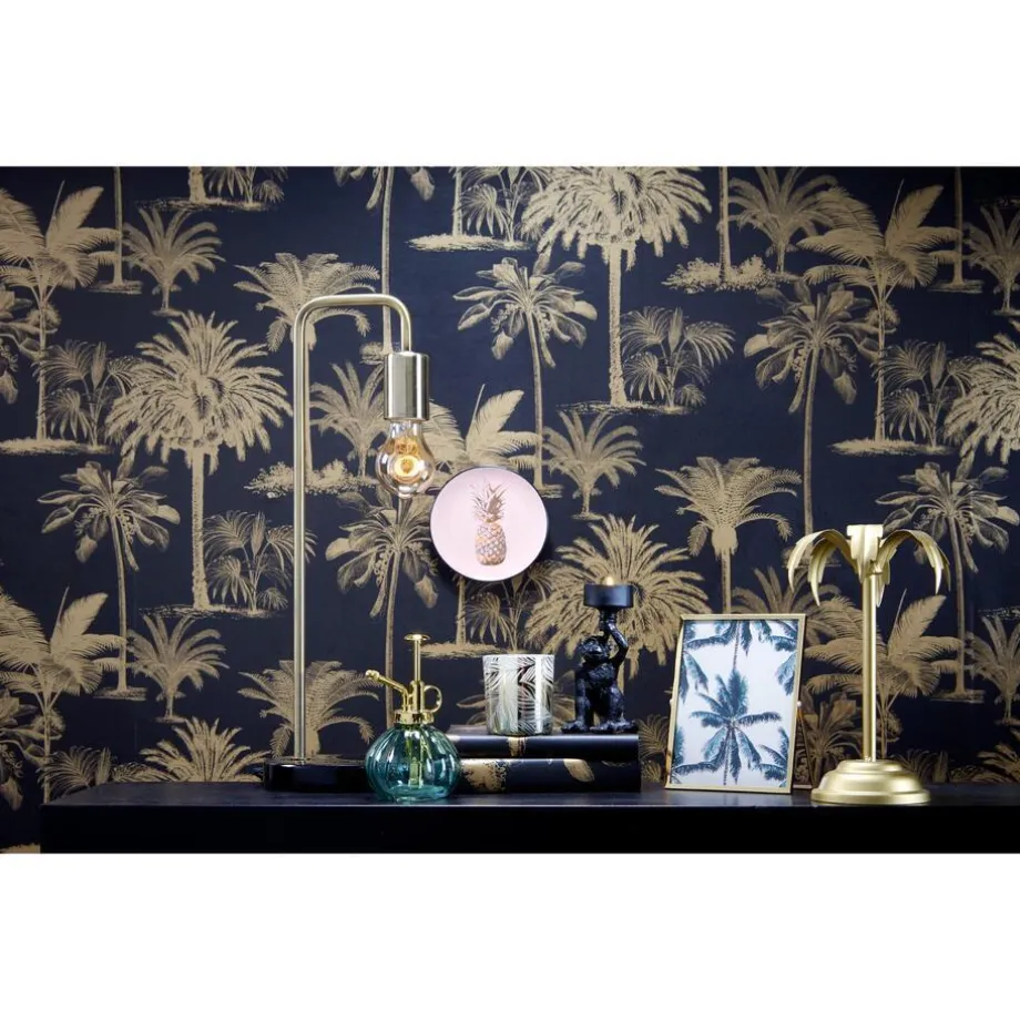 Zwart vliesbehang met tropisch dessin van palmbomen. Patroonhoogte: 53 cm. 10 meter per rol. Plakken met Perfax Roll-On.
