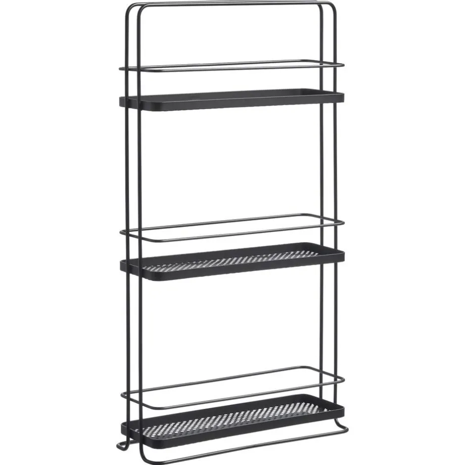 Rek van zwart metaal met drie boorden. 37x14x71 cm (lxbxh).