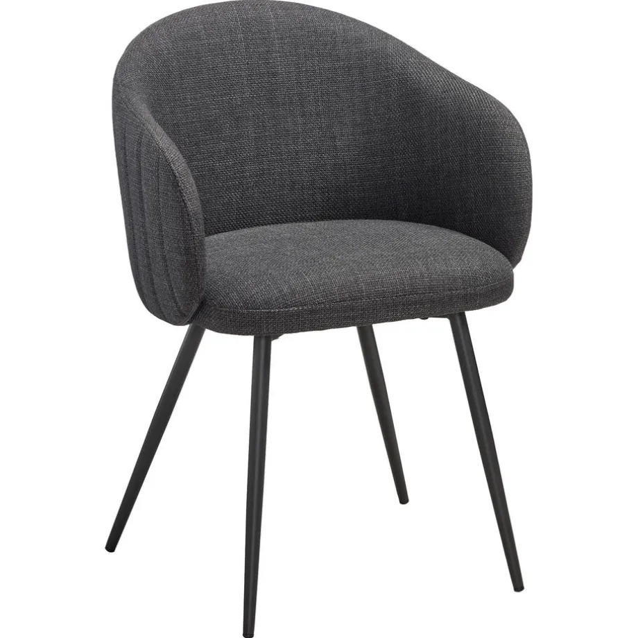 Charmante stoel gemaakt van een antraciet kleurige stof. Met dicht rug, schuin aflopende armleuningen en zwarte poten. 56×56,5×81,5 cm (lxbxh).