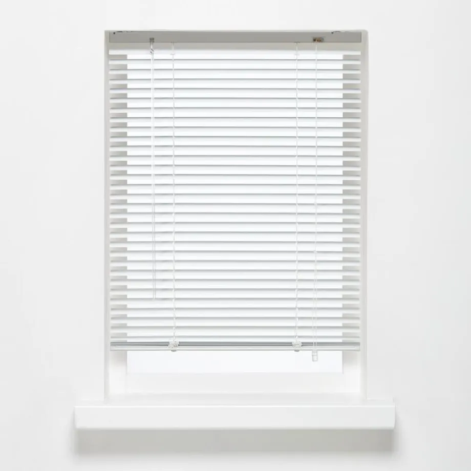 Jaloezie met witte aluminium stroken van 25 mm. Ideaal voor het regelen van licht en privacy. Eenvoudig zelf te monteren. Met vochtige doek reinigen. Het bedieningskoord zit aan de rechterkant, de tuimelstaaf aan de linkerkant. Inhoud verpakking: schroeven, pluggen, montagesteunen, kindveiligheidsclip, montagehandleiding en inkortinstructie.