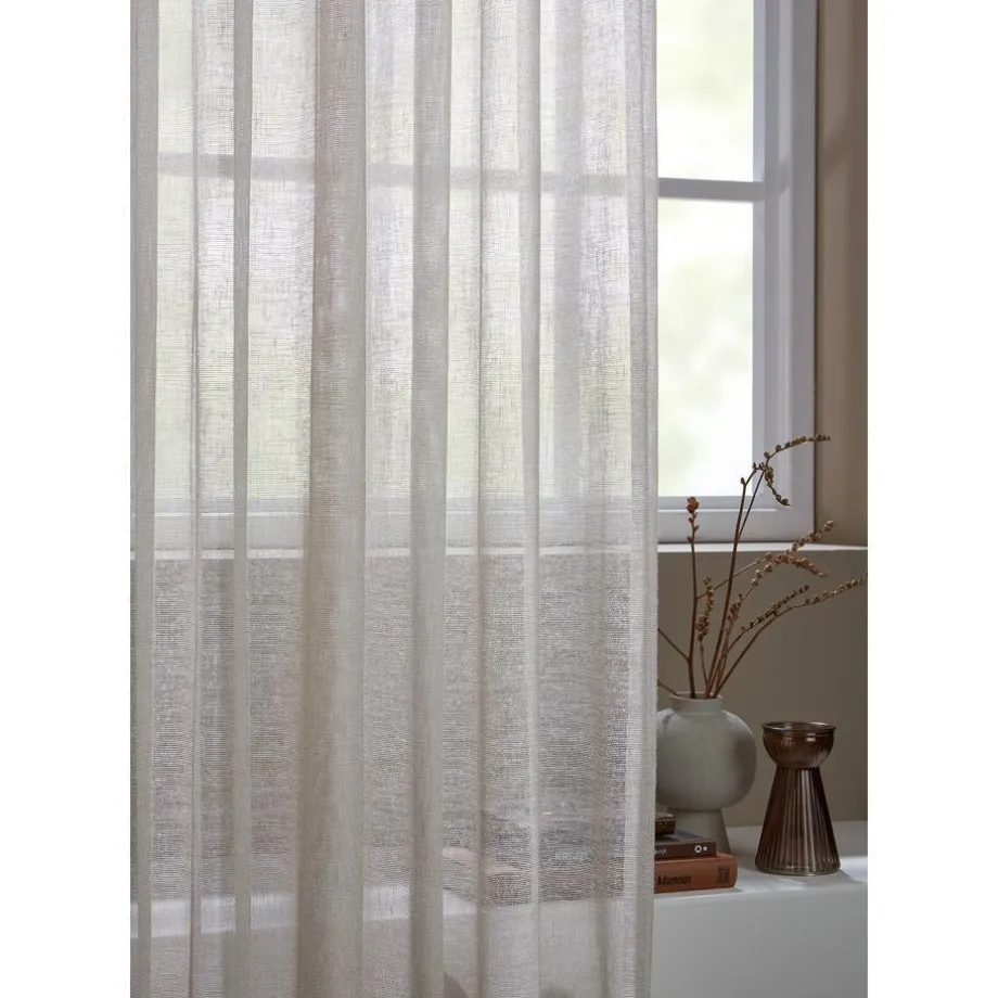 Lichtdoorlatende naturelkleurige inbetween linnen gordijnstof.
