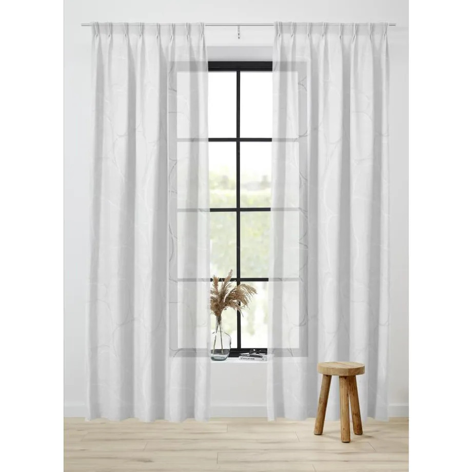 Kamerhoge vitrage off-white met subtiel cirkel dessin. Hoogte 298 cm.