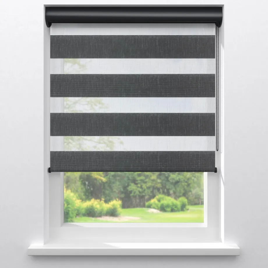 Duo rolgordijn Niek is opgebouwd uit antracieten ondoorzichtbare stroken en witte transparante stroken met lichte textuur. Met het soepele ketting systeem regel jij zo makkelijk lichtinval, verduistering en de mate van privacy. Duo rolgordijn Niek is gemaakt van 100% polyester en is daarom erg slijtvast. Daarnaast is de stof makkelijk schoon te maken met een vochtige doek.