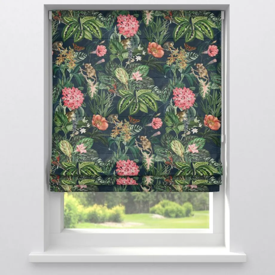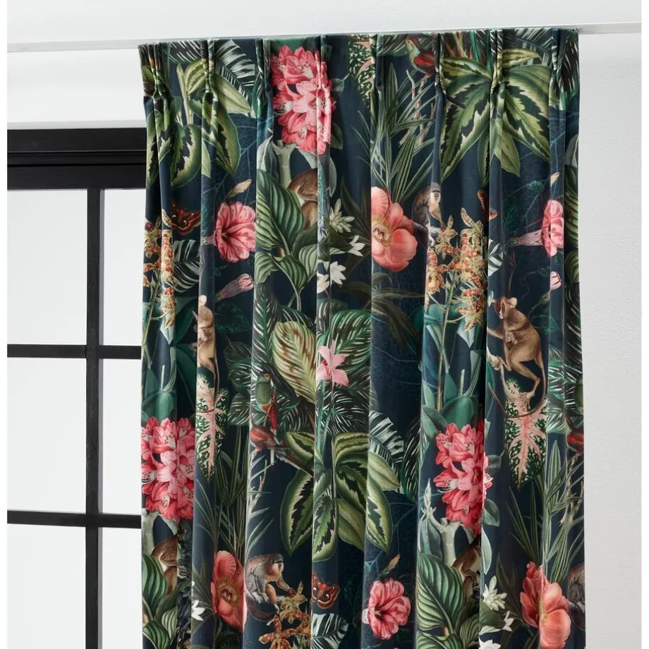 Lichtdoorlatende gordijnstof groen met bloemenprint. De glanzende velours stof is stevig, vormvast en soepel. 140 cm breed.