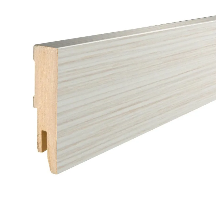 Grenen plint van MDF. Lengte: 240 cm. Dikte: 1.3 cm. Kleur: grenen.