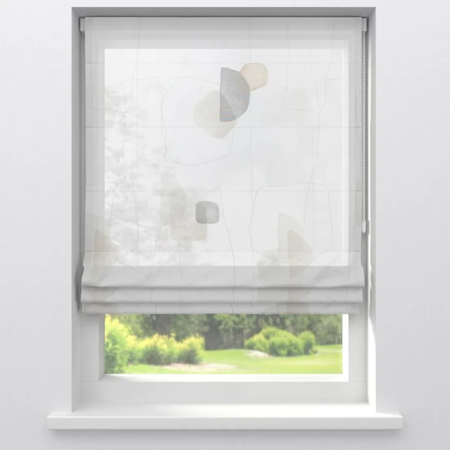 Transparante gordijnstof naturelkleurig met gedrukt abstract patroon. Stevig, vormvast en soepel. 300 cm.