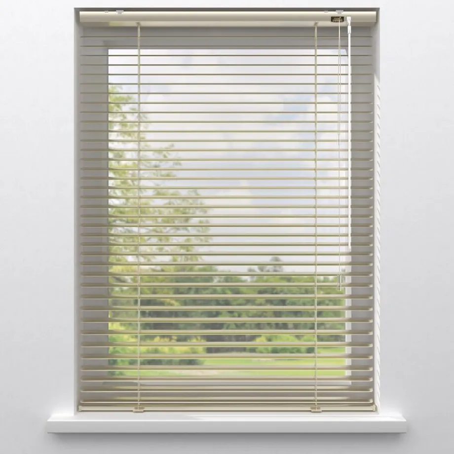 Aluminium jaloezie met zijdeglans goud 25mm lamellen. De jaloezie heeft meekleurende ladderkoorden, een aluminium systeemkleur en een transparante tuimelstaaf en cilindervormige koordhanger. De eindkappen zitten in de cassette verwerkt en hebben een transparante kleur. Met de handmatige bediening bepaal je eenvoudig de mate van lichtinval en privacy. De jaloezie is vochtbestendig, eenvoudig schoon te maken en geschikt voor keukens en badkamers. Op maat te maken en eenvoudig met de juiste afmetingen te bestellen. Geschikt voor zijgeleiding en draai-kiepramen. Niet volledig verduisterend.