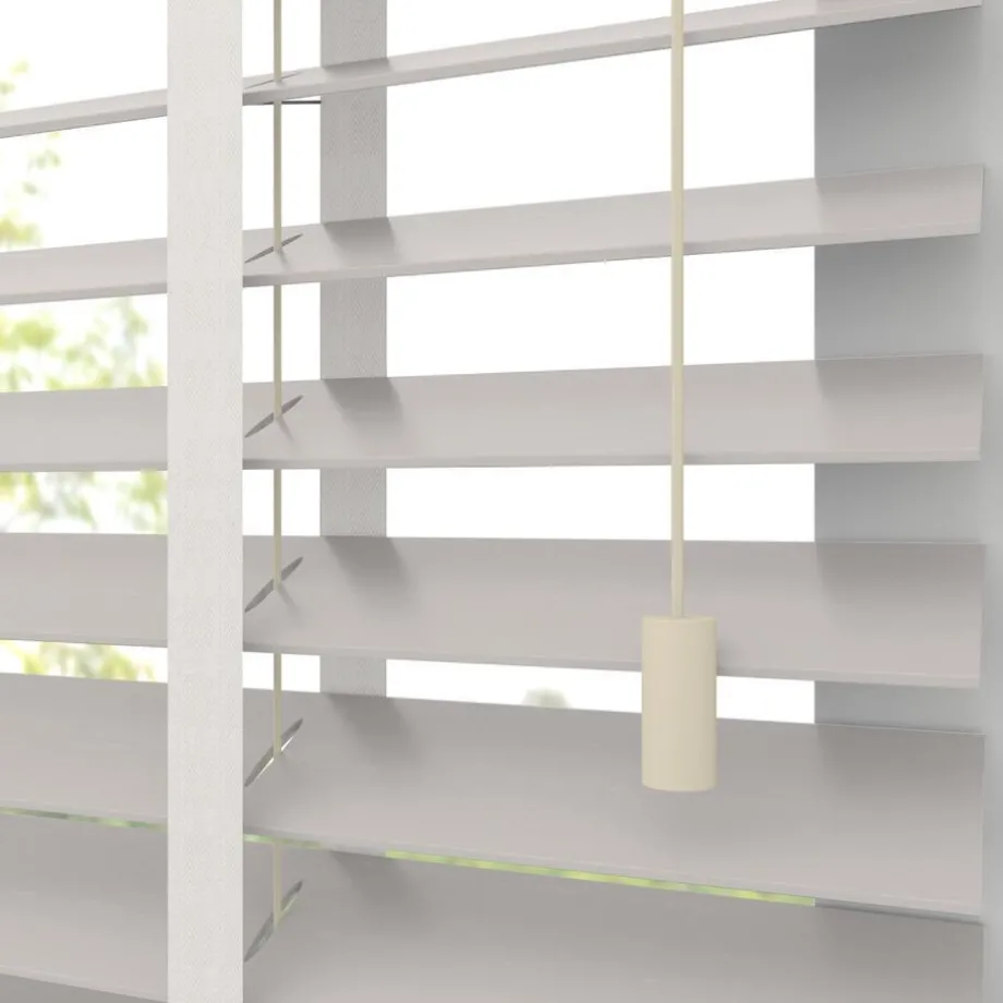 Houten jaloezie off-white met karakteristieke bamboe structuur en landelijke uitstraling. 100% bamboe. De brede lamellen van 50 mm zorgen voor veel lichtinval en bieden veel privacy wanneer je deze sluit. Op maat te maken en volledig naar wens samen te stellen. Bepaal zelf de bedieningszijde en kies uit diverse accessoires en uitvoeringen. Keuze uit een bijpassend ladderkoord, 48 verschillende ladderbanden en een koordhanger van hout, rvs of zwart metaal.