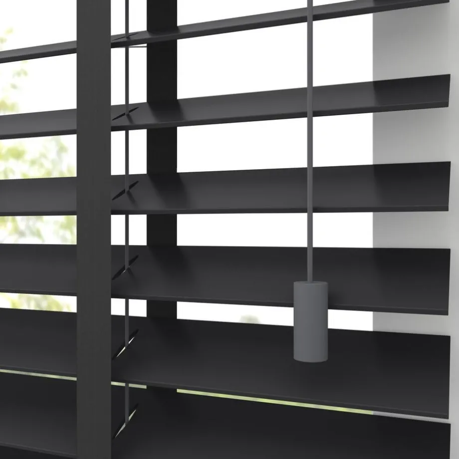 Houten jaloezie zwart met mat gelakte afwerking. 100% hout. De brede lamellen van 50 mm zorgen voor veel lichtinval en bieden veel privacy wanneer je deze sluit. Op maat te maken en volledig naar wens samen te stellen. Bepaal zelf de bedieningszijde en kies uit diverse accessoires en uitvoeringen. Keuze uit een bijpassend ladderkoord, 48 verschillende ladderbanden en een koordhanger van hout, rvs of zwart metaal.