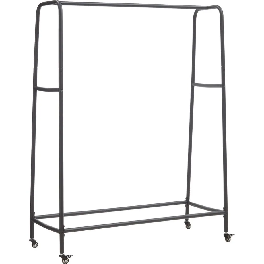 Kledingrek Onore in de kleur zwart is gemaakt van metaal en heeft handige wieltjes. Zo kun jij het rek overal naar toe rijden. Het kledingrek heeft een afmeting van 115x48x152 (lxbxh) centimeter.