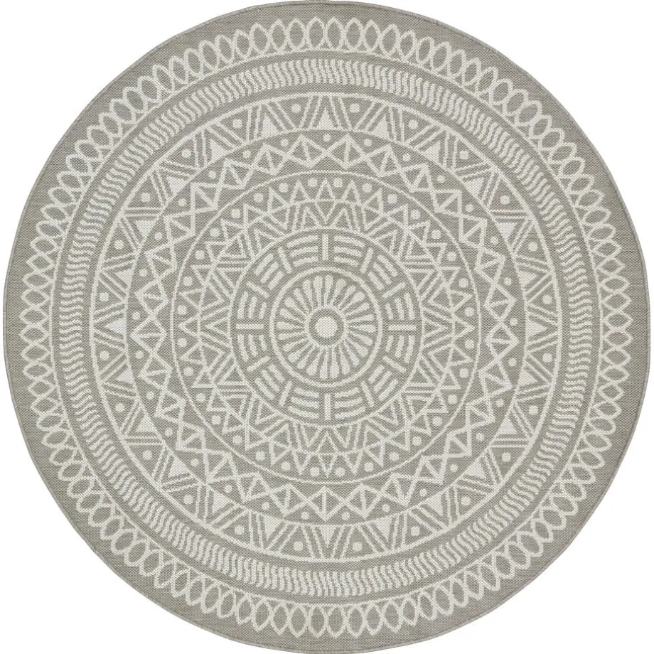 Rino is een rond vloerkleed die stijl en warmte toevoegt aan elke kamer. Met zijn lichte grijze kleur en opvallende Aztec print geeft dit vloerkleed een eigentijdse touch aan je interieur. De laagpolige textuur zorgt voor comfort en maakt dit kleed perfect geschikt voor drukbezochte ruimtes.