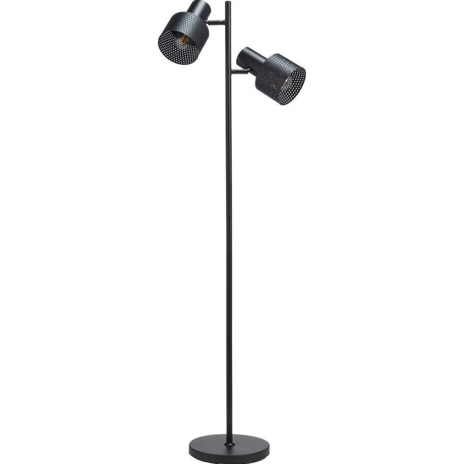 Vloerlamp van zwart metaal met twee lampen. Fitting E27, exclusief. Maximaal 40 watt. 43×25,4×142 cm (lxbxh).