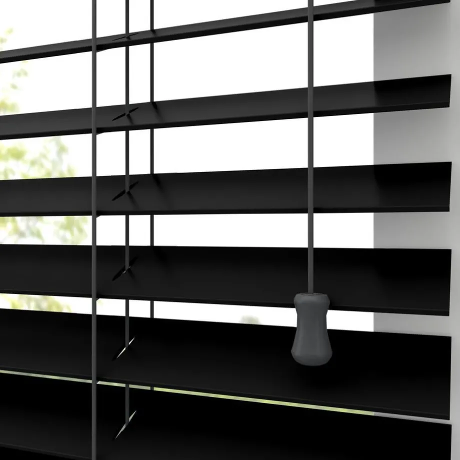 Houten jaloezie zwart. De brede lamellen van 50 mm zorgen voor veel lichtinval en bieden veel privacy wanneer je deze sluit. De bedieningszijde is rechts en links is de tuimelzijde. Op maat te maken en standaard uitgevoerd met een ladderkoord en een bijpassende witte houten koordhanger. Kies je liever een ladderband? Dan heb je de keuze uit diverse kleuren.
