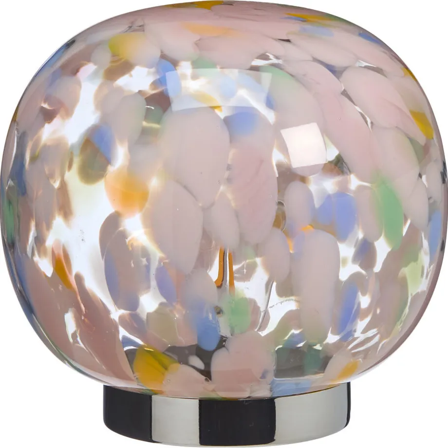 Tafellamp Nekkar is een vrolijke lamp met meerdere kleuren. Hij is gemaakt van glas en geeft een speels effect in je ruimte. De lamp heeft een geïntegreerde LED lamp die werkt op 2x AA batterijen (niet meegeleverd). De lamp geeft warm wit licht wat een gezellige sfeer creëert.