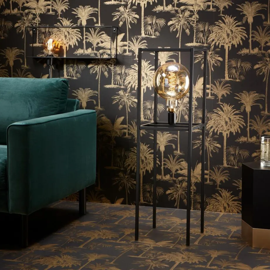 Zwart vliesbehang met tropisch dessin van palmbomen. Patroonhoogte: 53 cm. 10 meter per rol. Plakken met Perfax Roll-On.