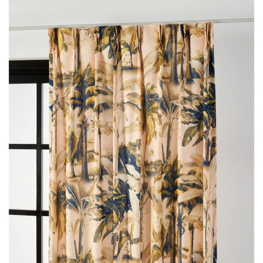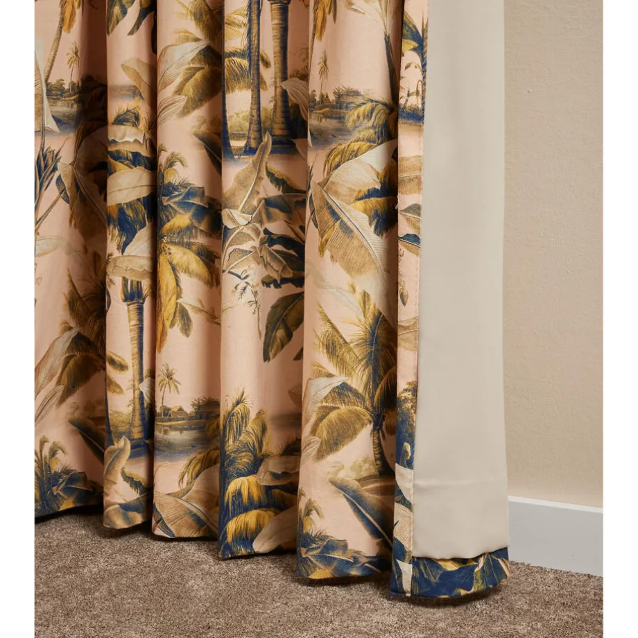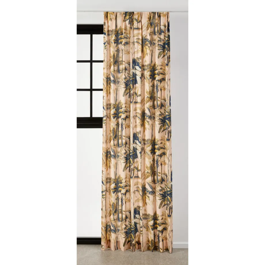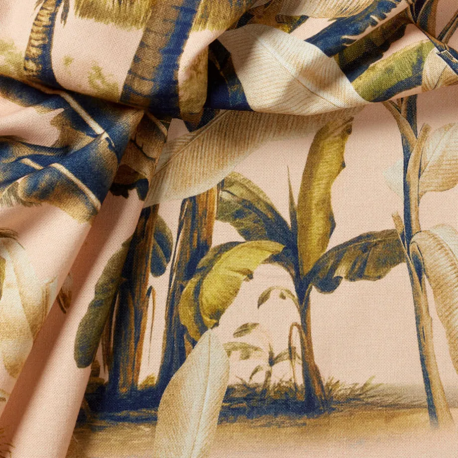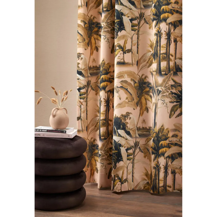 Lichtdoorlatende gordijnstof roze met botanische print. Soepelvallend, luchtig en stevig. Gemaakt van 100% katoen. 138 cm breed.